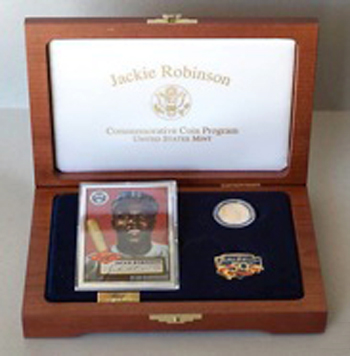 The Jackie Robinson 50th Anniversary $5.00 proof is sold in a special wooden box. The set includes a commemorative patch, pin and Topps Baseball reproduction card.