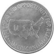 Reverse Description: In the center, A map of the United States. Around the rim, “Freedom and Opportunity for All – Americanism.”