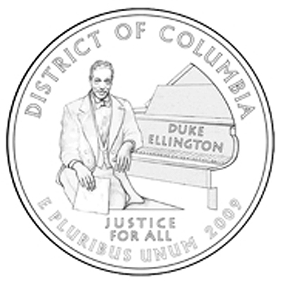 Reverse Description: The coin’s reverse design features an image of celebrated musician Edward Kennedy “Duke” Ellington seated at a piano with the inscriptions, DUKE ELLINGTON and JUSTICE FOR ALL, the District’s official motto. The District of Columbia quarter reverse was designed by U.S. Mint Artistic Infusion Program (AIP) Master Designer Joel Iskowitz and sculpted by United States Mint Sculptor / Engraver Don Everhart.