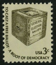 For the 3-cent ballot-box stamp he created for the U.S. Postal Service’s Americana series in 1977, Holbert researched early boxes, found a picture that he liked, and then created a pointillist rendition at stamp scale. After making the small drawing, he enlarged it to five times its actual size to sharpen small details, then reduced this larger version to create the final design at philatelic dimensions and complete with perforations.