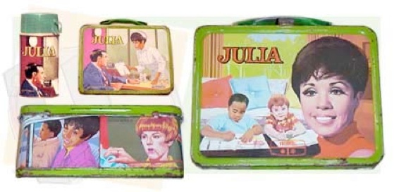 Late to the game, lunch boxes with Black characters did not appear until the Julia lunch box. Julia, starring Diahann Carol in the title role, premiered on television in 1968. The series offered a different view of family life with a Black single working mother and her son. King Seeley (The Thermos Company) produced the Julia metal lunchbox with matching steel thermos in 1969.