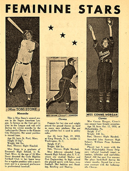 female starsWhat wasn’t uncommon about baseball then was women took part in Negro League baseball, among them Toni Stone, Mamie Johnson and Connie Morgan. Stone played from 1949 until 1955 with such outfits as the New Orleans Creoles and the Indianapolis Clowns. Johnson (nicknamed “Peanut”) was the first woman to pitch in the Negro Leagues, and built an impressive record of 38 wins and only 8 losses for her career. Morgan started in an all-women’s league (where she had a .368 batting average) before joining the Clowns in 1954.