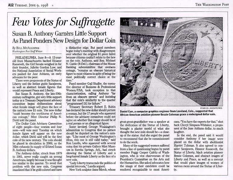 In 1998, the Dollar Coin Design Advisory Committee (DCDAC) was convened with the purpose of deciding what woman to portray on a new US “Golden” $1 circulating coin. Committee members included Mint Director Philip Diehl and Delaware Congressman Michael Castle. A brass concept coin featuring Bessie Coleman was designed and presented to the committee in person by Daniel Carr. At one point in the DCDAC deliberations, the Bessie Coleman proposal was in second place behind Sacagawea as the committee’s choice.