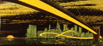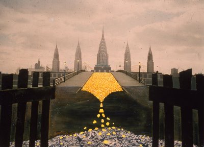 The multi-talented Walton designed the sets along with Philip Rosenberg, creating a yellow brick road out of Congoleum at the Astoria studios in Queens. Apparently the flooring company came out with a style called Yellow Brick Road in their collection shortly after the film premiered. Many of the film’s special effects were created with matte paintings, as evidenced by the Manhattan skyline scenes below, by the Hollywood master Albert Whitlock.