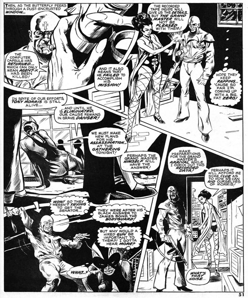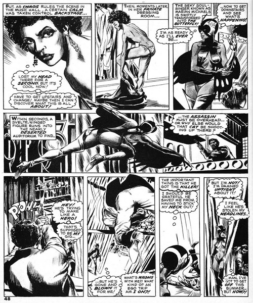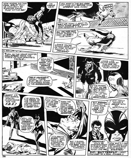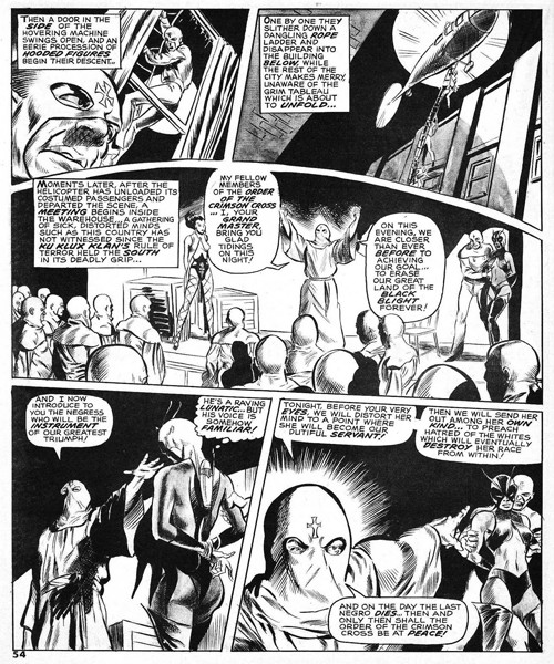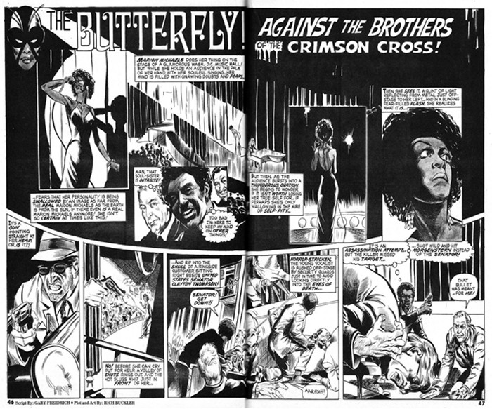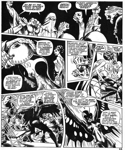 “The Butterfly Against the Brothers of the Crimson Cross”. We are introduced to Tony Morris, FBI special investigator, who looks like he was going to be the romantic interest for Marian Michaels, alias The Butterfly. In this issue Butterfly’s opponents are a Ku Klux Klan-type white supremacist secret society with a leader who’s penetrated the upper levels of power in Washington. The mission of the Brothers of the Crimson Cross is nothing less than the total eradication of non-white races in America.