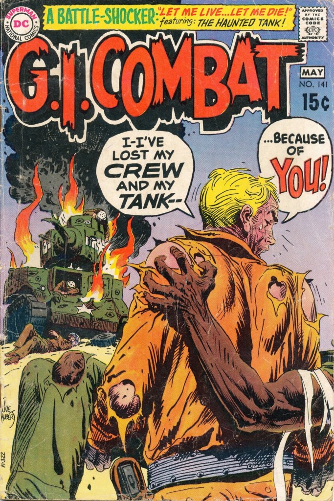 Joe Kubert’s cover of G. I. Combat 141, like many DC covers from the late 60s or very early 70s, is somewhat misleading. Taken at face value, and it’s the word balloons that do it, the cover suggests to readers that in the story the Haunted Tank is going to be destroyed, and that somehow it will be the fault of a Black man. Quite why DC would want to create the latter impression is curious, because Robert Kanigher’s story reads with an integrationist, anti-racist message. The story begins with the Haunted Tank crew re-stocking with ammunition from a supply depot manned by a segregated Black unit, much as would have often been the case in WWII.