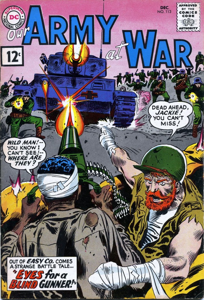 DC’s Our Army At War 113 (December 1961) appears to be the earliest example of a racially integrated comic book that doesn’t use insulting stereotypical images of Blacks. As I read the story I didn’t pick up any hint of racial prejudice. The artwork is fantastic, even for Joe Kubert. It’s also a well-written piece. The most significant thing about it, though, is that race is not overtly identified as an issue even though a Black character is one of the main protagonists in this one. At the time it was published this was an extremely revolutionary thing to do in comics. The members of Easy Co. act towards each other as if they are close buddies. It is a very powerful statement of the way things should be. The similarity (in appearance) between Wild Man and Dum Dum Dugan of the Howling Commandos is interesting. It does appear that Lee and Kirby could have built on this idea of an integrated platoon when they launched Sgt. Fury early at the end of 1962.