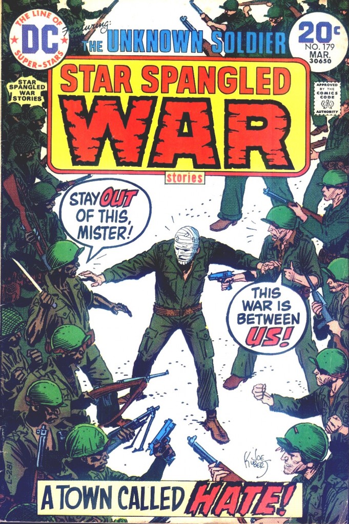 With Archie Goodwin as editor, this issue of Star Spangled War Stories #179, March 1974 features an Unknown Soldier story that exposes the intense racial infighting that had been a serious problem in the U.S. military during the Vietnam conflict, using a WWII setting. In the Armed Forces Journal in 1971, Col. Robert D. Heinl, Jr. wrote: “The morale, discipline and battleworthiness of the U.S. Armed Forces are, with a few salient exceptions, lower and worse than at any time in this century and possibly in the history of the United States. By every conceivable indicator, our army that now remains in Vietnam is in a state approaching collapse, with individual units avoiding or having refused combat, murdering their officers and non commissioned officers, drug-ridden, and dispirited where not near mutinous. Elsewhere than Vietnam, the situation is nearly as serious. Intolerably clobbered and buffeted from without and within by social turbulence, pandemic drug addiction, race war, sedition, civilian scapegoatise, draftee recalcitrance and malevolence, barracks theft and common crime, unsupported in their travail by the general government, in Congress as well as the executive branch, distrusted, disliked, and often reviled by the public, the uniformed services today are places of agony for the loyal, silent professionals who doggedly hang on and try to keep the ship afloat.”
