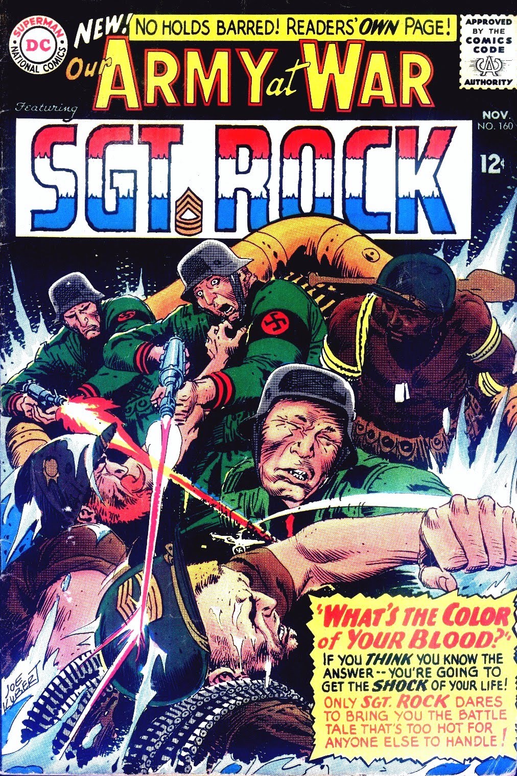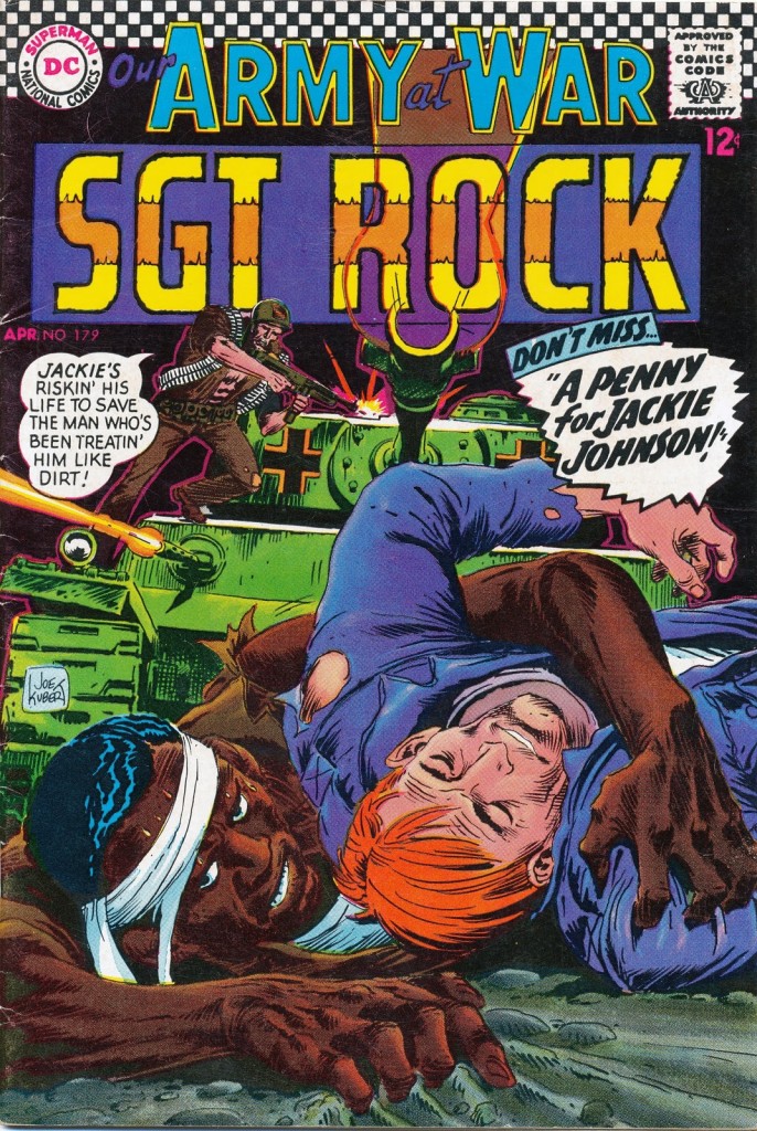 The Sgt. Rock & Easy Co. story in DC’s Our Army At War  #160 (November 1965) again features Jackie Johnson. The story retcons a heavyweight boxing champ background for Jackie, with him having lost the title prior to enlisting, to a Nazi paratrooper, whom he meets again on the battlefield. Rock, Wild Man, and Jackie are captives of the Nazi scum, and the Nazi heavyweight boxer gives Jackie a rematch, with the intent of beating Jackie into submission and getting him to admit his blood is a different color than that of the ‘Master Race’. As he watches Jackie deliberately take a beating (to avoid Rock and Wild Man getting killed in retaliation, should he beat the Nazi in the bout) but stubbornly refuse to give the Nazi his satisfaction, Rock recalls seeing Jackie in the ring at Madison Square Garden when he was a boxer himself, watching Jackie for pointers on how to fight well. Rock had recognized then the additional burden Jackie had been carrying, of having to prove himself twice over, as an individual fighter, and as an African American. When Jackie had eventually won the title, and then lost it to the Nazi, the latter had taken the opportunity to use his victory as propaganda for the supposed superiority of the ‘Master Race’ – WWII was a war about racism.
