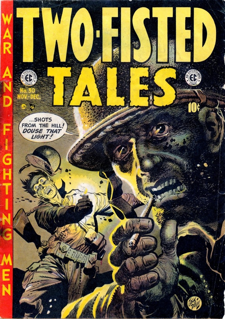 The first occasion that I am aware of on which comics addressed the issue of inter-racial strife within the US armed forces was in Two-Fisted Tales 30 (Nov-Dec 1952), in the story “Bunker!”, written by Harvey Kurtzman and drawn by Ric Estrada, with colors by Marie Severin. The famous cover of this issue is by Jack Davis. The plot of “Bunker!” is straightforward. There’s some Chinese soldiers holed up in a very strategically placed bunker, pinning down two platoons of U.S. troops, one segregated Black and the other segregated white. The two groups of American men are on different sides of the bunker, each trying to take the hill on which it is located.